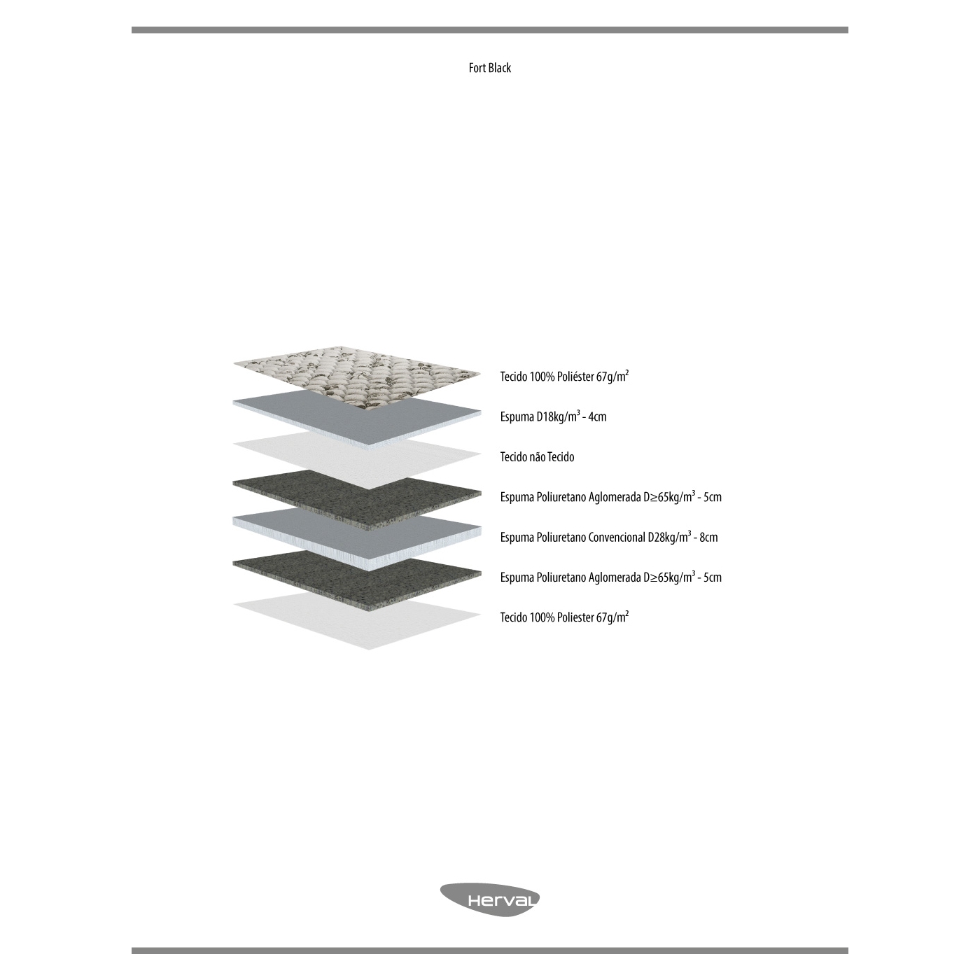 O colchão Fort Black foi desenvolvido para agregar o conforto das já consagradas espumas Herval à sua noite de sono. Internamente, a estrutura do colchão é formada por uma composição de espumas de média e alta densidades, garantindo alta durabilidade ao seu colchão e trazendo ainda mais conforto. Na parte superior do colchão, conta com um exclusivo detalhe de pillow top, agregando uma camada a mais de conforto ao usuário.